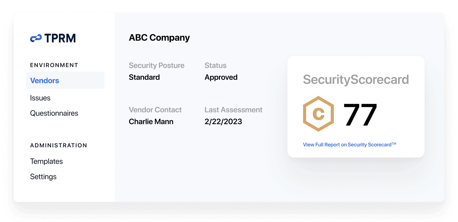 Automatically assess program maturity against an established framework based on target and actual metrics in CrossComply with Maturity Assessments. Map related vendors, products, and fourth parties to each other in TPRM with Vendor Relationships to automatically aggregate risk scores in a single view. This feature, along with our SecurityScorecard (SSC) Integration, which automatically displays SSC risk scores and grades in TPRM for SSC subscribers, enables teams to better understand vendor health and impact when issues are identified. Click here to learn more.